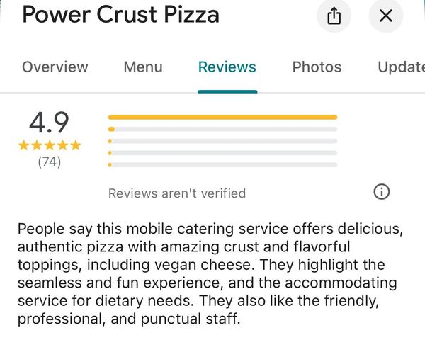 Power Crust Pizza were amazing right from the start! Such great and friendly customer service all the way through. Everyone said how delicious the pizzas were- we even had the leftovers for lunch the next day!